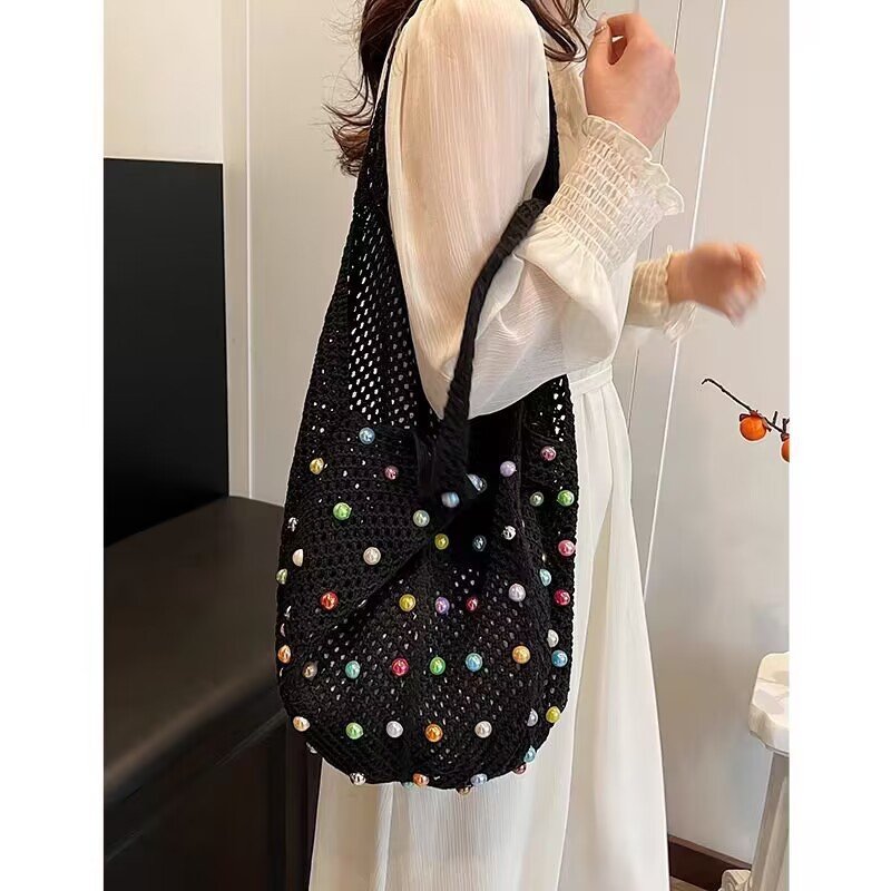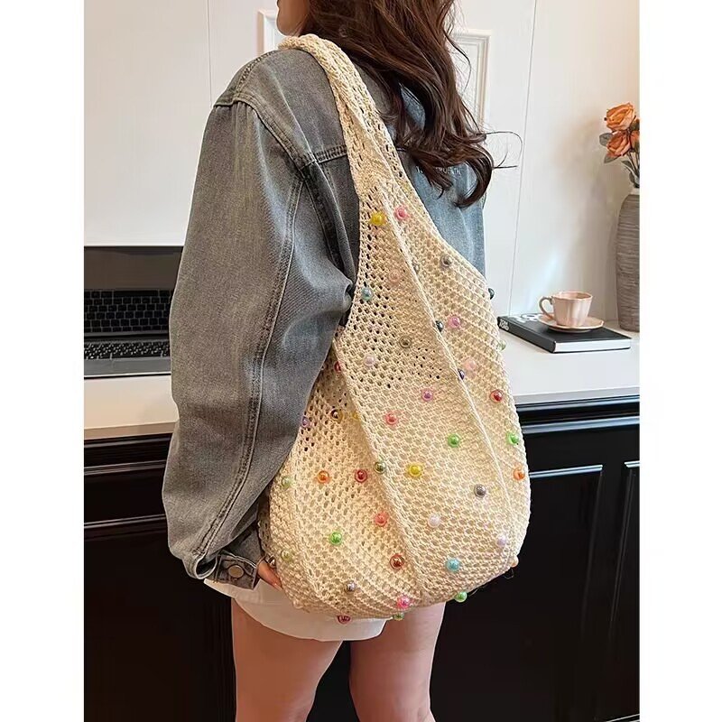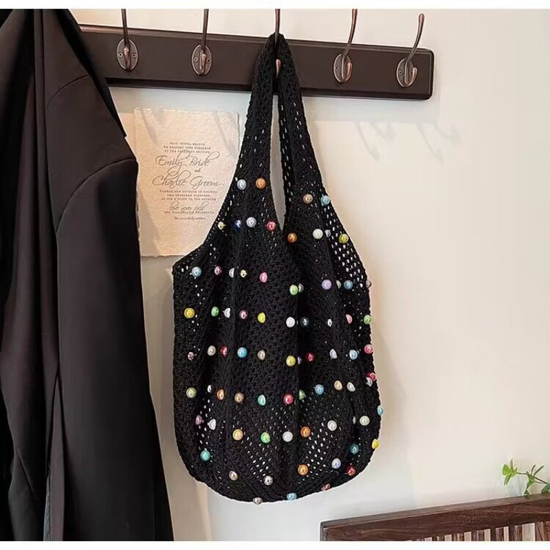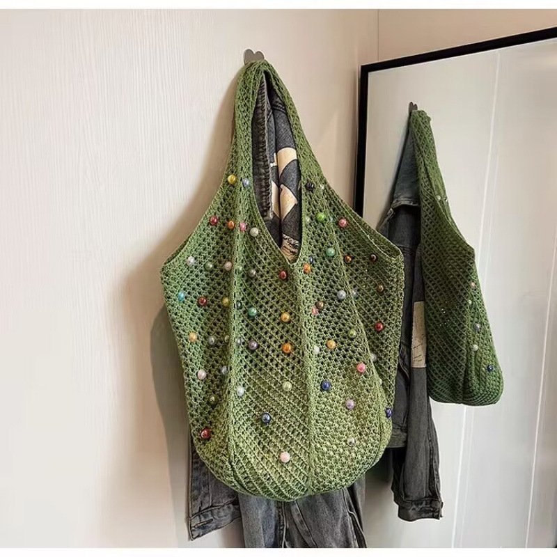 This beaded bag blends mixed aesthetics with practical design, making it perfect for leisure travel and everyday carry . Featuring a unique woven texture and available in versatile shades of off-white, black, khaki, and green , this bag is offered in both premium versions with durable finish and ordinary versions with a softer texture . Its open-top design ensures easy access to essentials, while the spacious structure provides plenty of room for travel or daily needs.