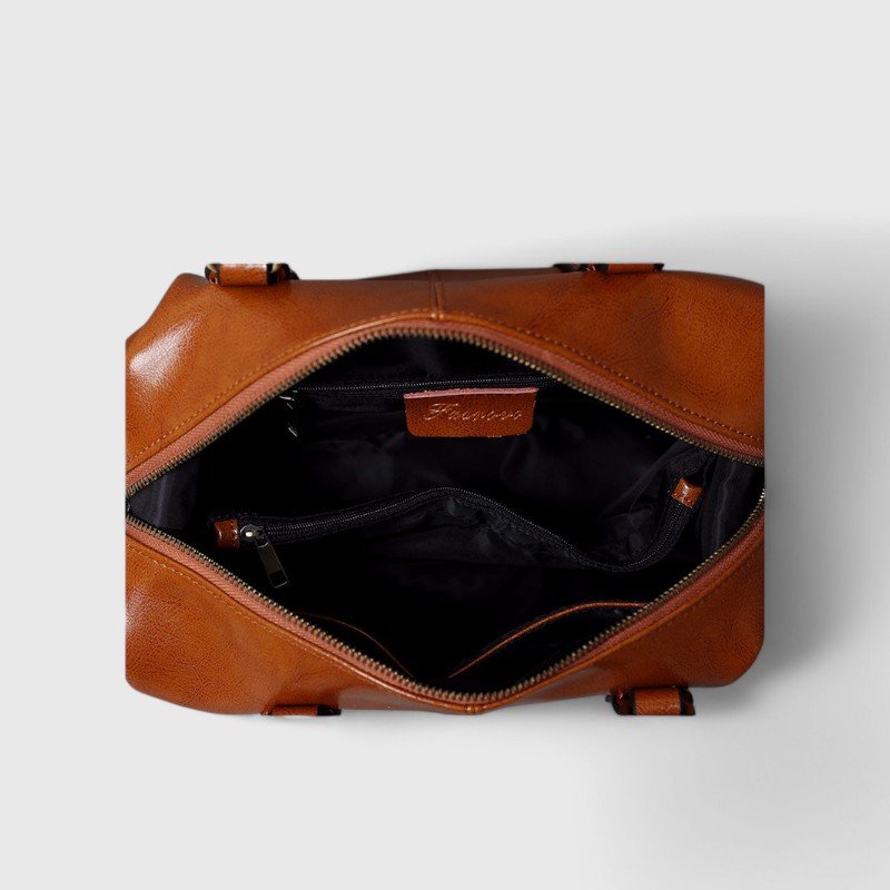 The Opal Journey is a stylish and compact duffel-style bag, crafted from what appears to be smooth leather. The bag has a structured design with double top handles and a double-zipper closure. Its sleek and modern look makes it suitable for both casual and more dressed-up occasions.
