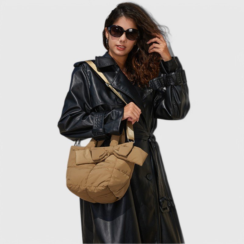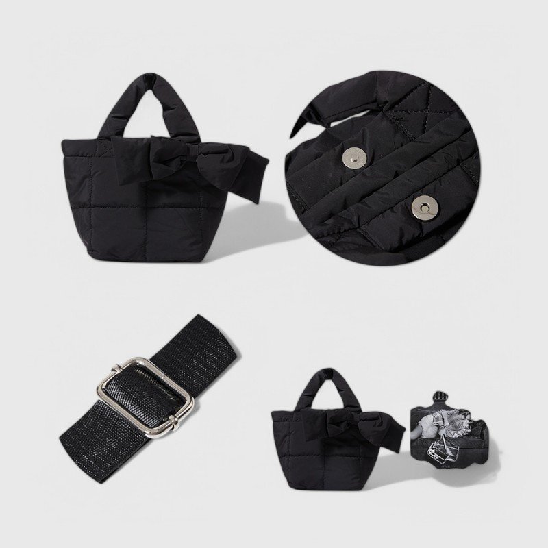 Inspired by the cozy feel of a down jacket, this oval-shaped tote brings a stylish winter update to your daily carry. Finished with a charming bow and soft padding, it features a zippered sandwich pocket inside and a magnetic clasp for secure storage.